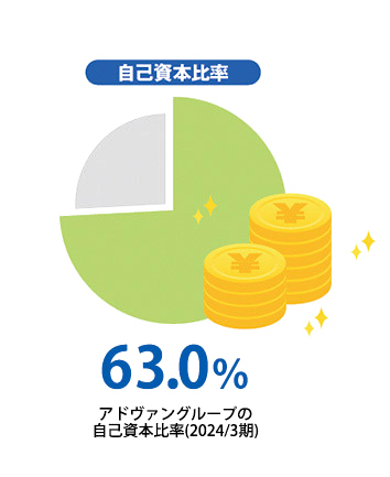 東証上場企業の平均自己資本率は33.7%なのに対し、アドヴァングループは63.0%(2024/3期)となっています。